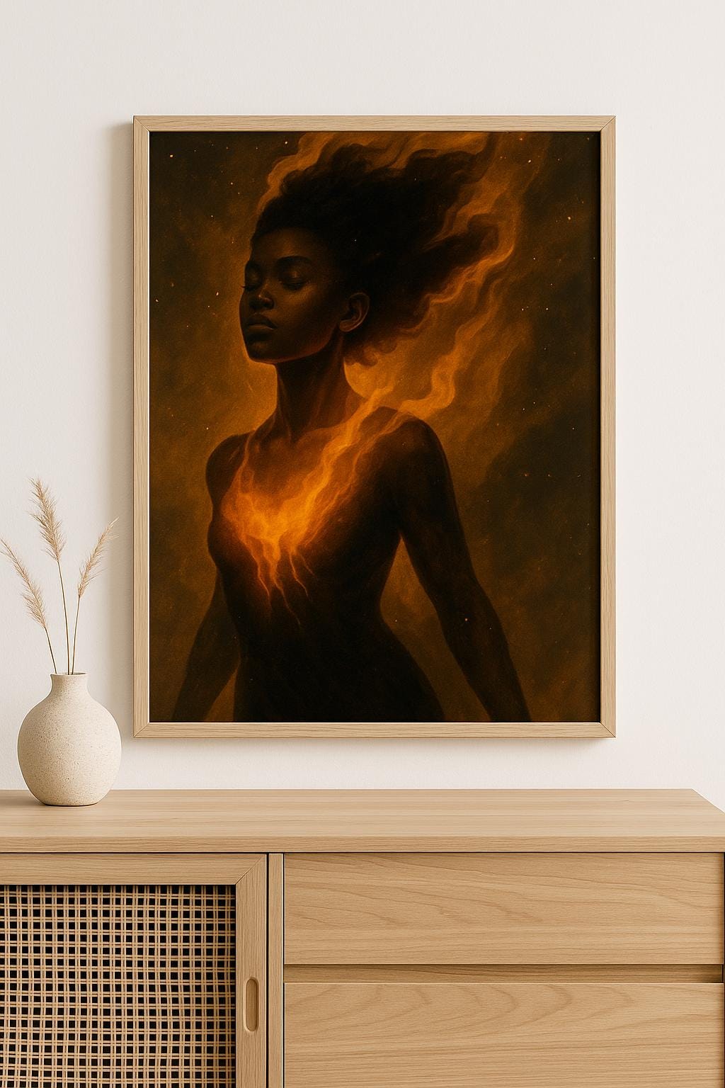 This powerful Afrocentric art print features a Black woman emerging from flames, her chest glowing with inner fire. Paired with an original quote by Asma Love —
