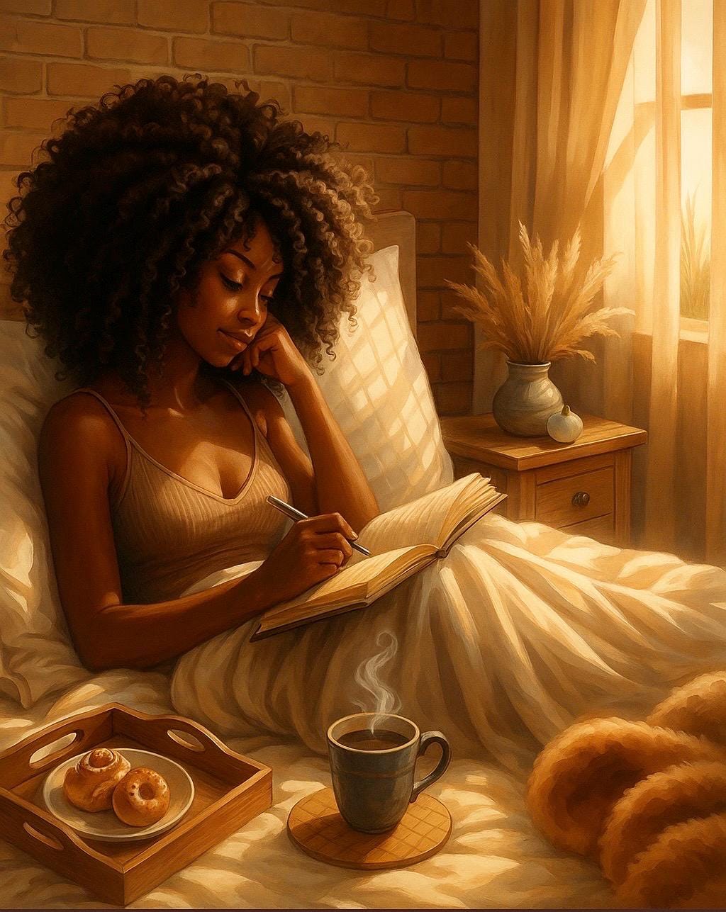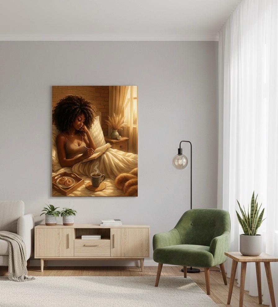 This illustration features a beautiful Black woman journaling in a cozy sunlit room with warm tones, soft textures, and a peaceful morning ambiance. It’s ideal for anyone who loves self-care, intentional living, and melanin-inspired home decor.
