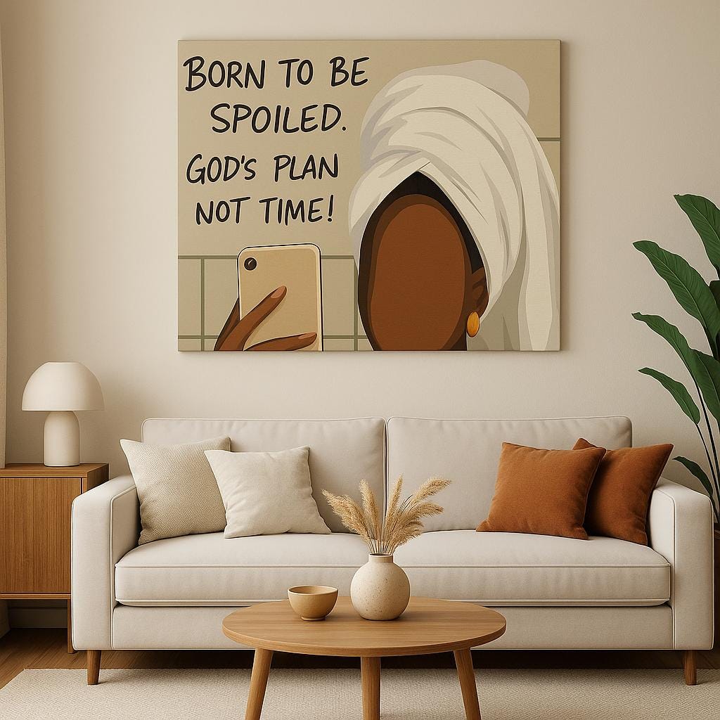 Give your space a soft, confident touch with this “Born to Be Spoiled — God’s Plan, Not Time!” canvas. Designed for the Black Girl Soft Era, this modern bathroom/self-care inspired artwork adds warmth, style, and personality to any room.